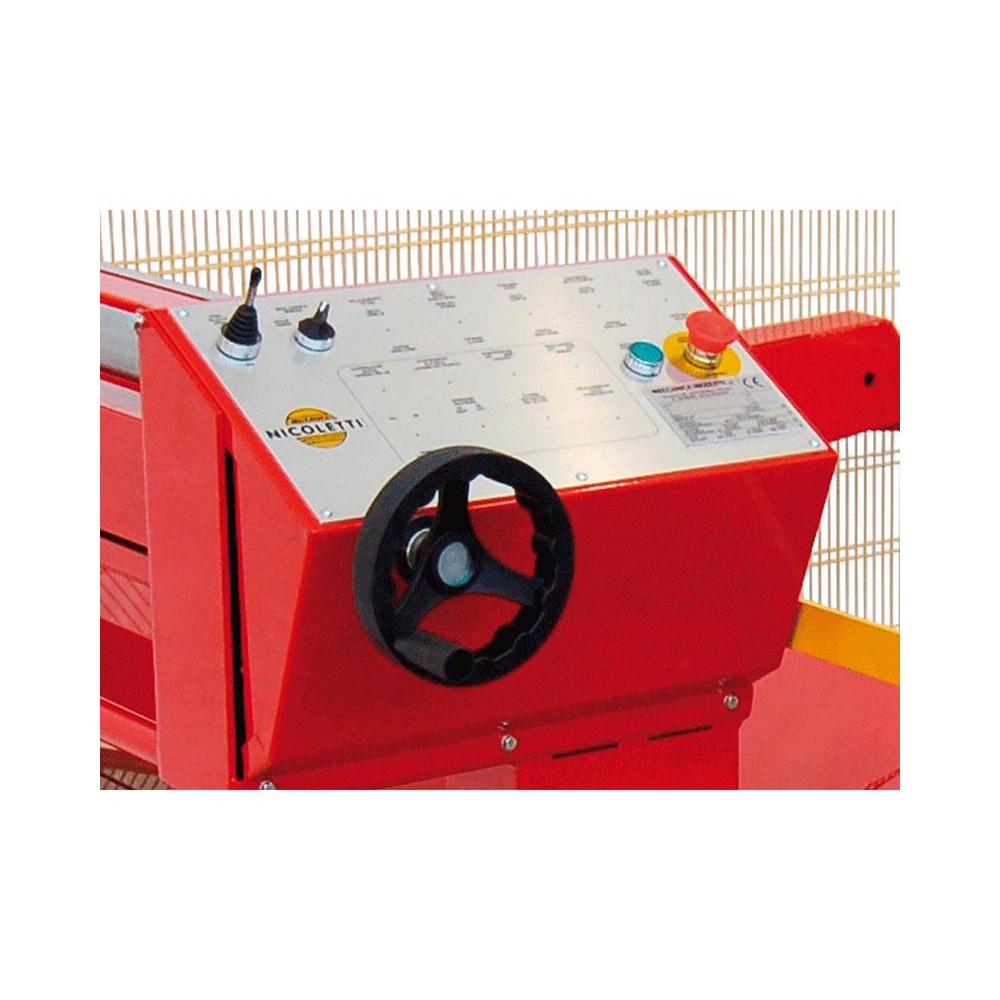 Measuring device for cable layering driven by worm screw; operated via handwheel mounted on side; enables the operator to work from the side of the machine to comply with safety rules